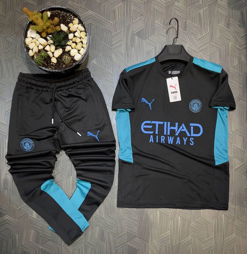 ارتقِ بإطلالتك الرياضية مع هذا الطقم المميز بلونٍ أسود وتصميم لمسات جانبية باللون السماوي.